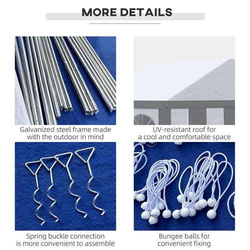 Shield yourself from the sun and light weather with the protective roof of this garden tent, allowing you to enjoy your event without worrying about the elements. Built on a galvanised steel frame, this party gazebo is both strong and sturdy, ensuring stability throughout your event. We've included four guy ropes, four spiral stakes, and twelve ground stakes to secure your tent to the ground firmly.