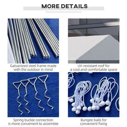 Built with a durable galvanised steel frame, our party gazebo provides a strong and sturdy structure you can rely on. Complete with four guy ropes, four spiral stakes, and 20 ground stakes, this tent can be securely anchored to the ground, ensuring stability even on breezy days.